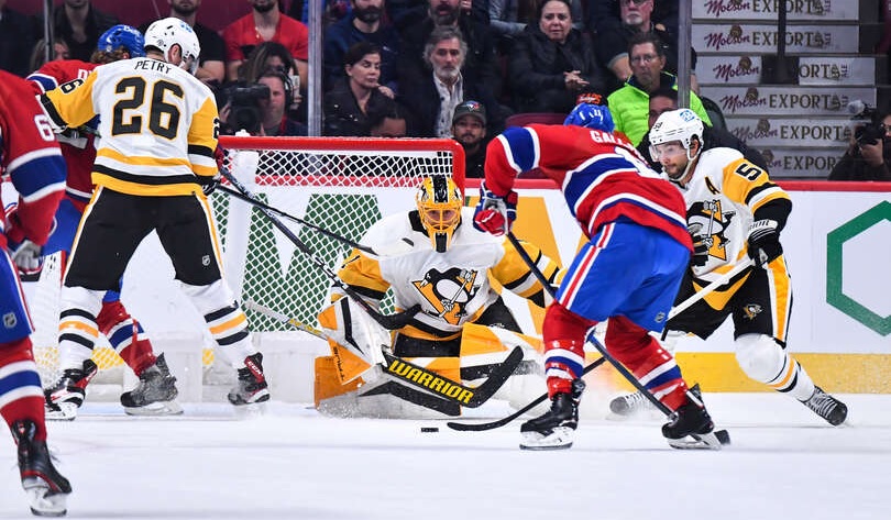 That seemed to give Montreal some skating legs. A couple of minutes later, Josh Anderson got a step on Pierre-Olivier Joseph but his backhander went wide. Four minutes after that, Kris Letang turned it over in his own zone right to Cole Caufield but the winger had to wait to get his shot off which allowed Casey DeSmith to be in position to cover it up.
