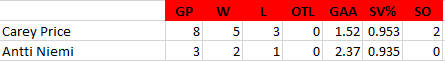 Balanced scoring was the order of the month, with the leading scorers, Max Domi and Tomas Tatar, posting just seven points apiece, however, there were nine players that put up at least five points in January. The goaltending was likely the difference, as Antti Niemi was good and Carey Price was excellent, posting a sparkling 0.953 save percentage.
