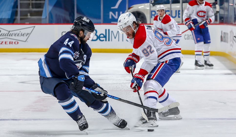 The Habs tried to find the road to victory during Saturday’s late-night start in Winnipeg after losing their last four games. Newly appointed coach Dominique Ducharme wasted little time in mixing things up as Jake Allen was the goaltender facing Connor Hellebuyck for this one. The blue line kept the same pairings, but what the team diagnosed as a short-term injury to Josh Anderson meant some changes up front. Tyler Toffoli moved up to the top unit beside Nick Suzuki and Jonathan Drouin, Jesperi Kotkaniemi was flanked by Artturi Lehkonen and Joel Armia, and Jake Evans returned to play alongside Paul Byron and Corey Perry.