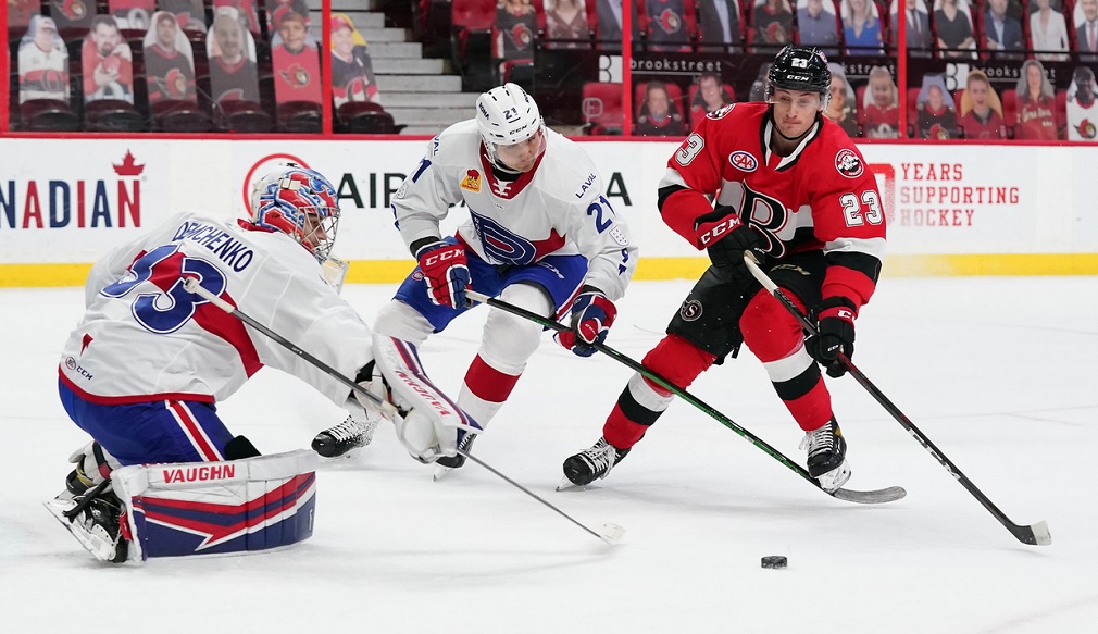 Apr. 23: Rocket 3, Senators 0 – After fading defensively in the opener, Laval put on a defensive clinic from start to finish, holding Belleville to just a dozen shots for the game (and only one in the third period). Yannick Veilleux opened the scoring and was ejected in the third for instigating a fight while Ryan Poehling and Teasdale had the other goals.