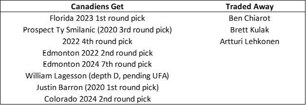 First off, consider having Ben Chiarot, Brett Kulak, Alexander Romanov, and Joel Edmundson in the lineup and upcoming prospects in Jordan Harris, Kaiden Guhle, and Mattias Norlinder all playing left defence. It’s pretty obvious the Habs have too many left-shot defenders. Given the ages and upcoming UFA status of Chiarot and Kulak, they were the obvious ones to go. Everyone including my dead grandmother predicted they would be traded. Absolutely Hughes got a great return but I suspect they were still pretty easy conversations given the limited options available for left defencemen.