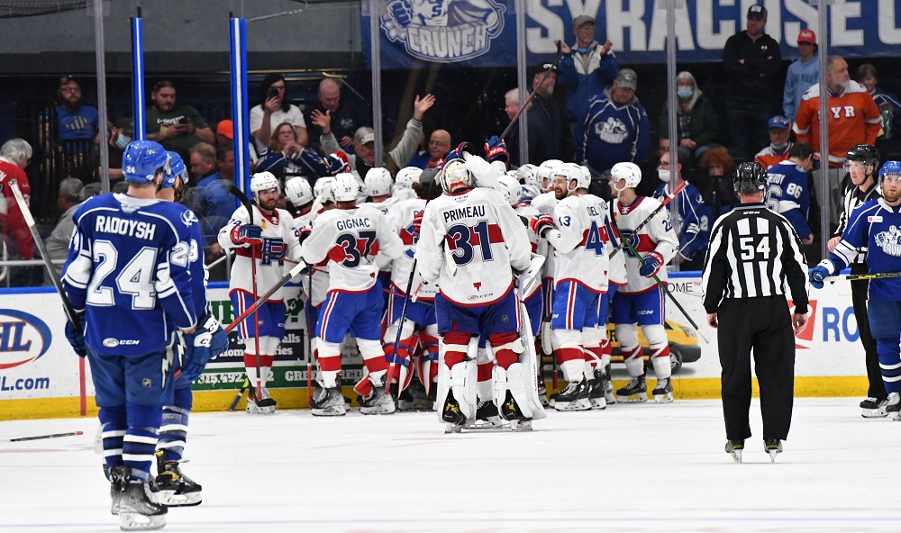 May 7: Rocket 3, Crunch 2 – Playing just 24 hours later in a rather odd scheduling quirk, Laval flipped the script and came back after allowing one early to take the lead in the second period on Belzile’s third of the series. Daniel Walcott – who was a thorn in Laval’s side all series – tied it in the third and it looked like it was going to overtime until Brandon Gignac scored with less than two minutes left in regulation and the Rocket were able to hold onto the lead from there. Cayden Primeau made 36 saves in a stellar playoff debut.
