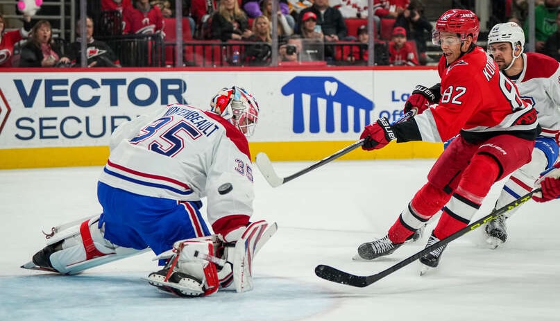 Montembeault could not keep Carolina at bay all night and he was finally solved 12:14 into the period when Jesperi Kotkaniemi scored. A defensive play similar to Ylonen’s was made by Martin Necas which sent Kotkaniemi on a 2-on-1. Wideman covered the pass as Belzile closed in on Kotkaniemi, but the former Hab gave a late surge to cut across and beat Montembeault.