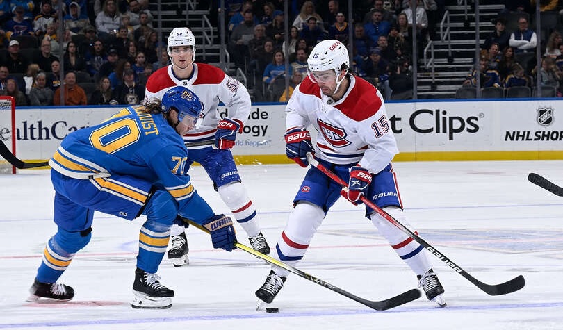 1) The Blues seemed to have caught the Habs unaware with the early pressure, and multiple early rush opportunities. Samuel Montembeault bailed the defence out on an early shot by Colton Parayko, but just 30 seconds later, Justin Faulk sent a pass across the front of the net, and Montembeault had no answer to Brayden Schenn’s shot.