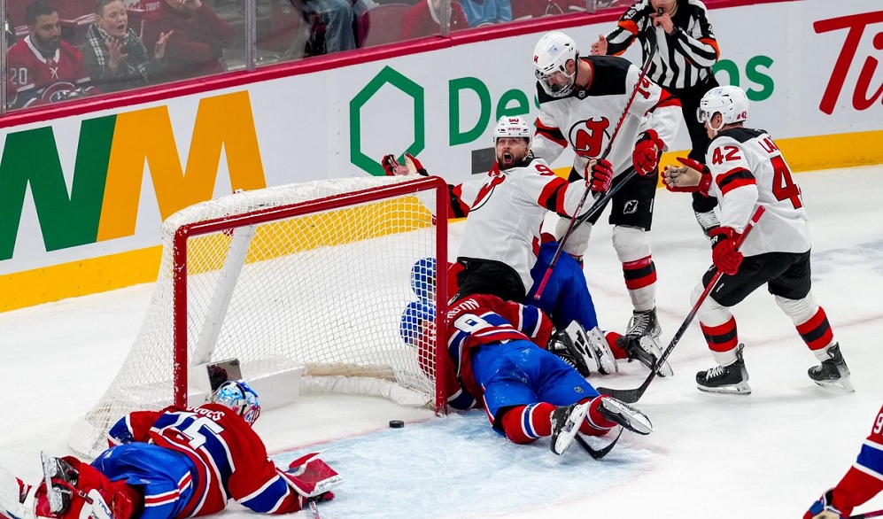 8) And the third period? Would you ever have guessed five minutes of Montreal domination, followed by New Jersey pressure? Again, the pressure paid dividends, this time on a set play from an offensive faceoff. Suzuki beat Ondrej Palat on the puck drop and got the puck back to Guhle at the point. Guhle sent it across to Alexandre Carrier, who slammed the puck past Allen to tie the game.