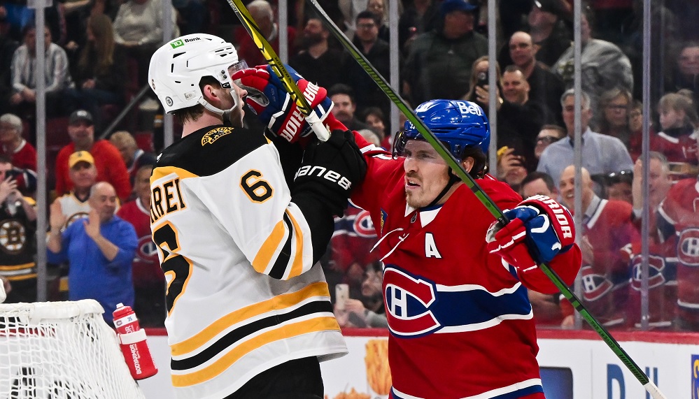 3) In those final two minutes, the Christian Dvorak line had Montreal’s best shift of the opening period. They had two strong scoring chances with one being swept off the goal line while Dvorak rang one off the post soon after. Moments later, it was a Boston two-on-one with John Beecher being stopped before Patrick Brown thought he could subtly push Montembeault and the puck into the net and somehow, in an era of video replay, no one would notice. That set off a scrum with Brown getting the extra two minutes for slashing, probably because they couldn’t give him a minor for stupidity.