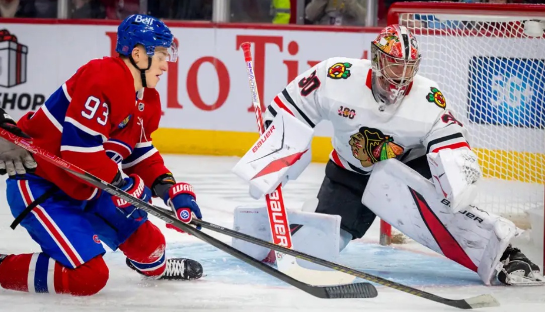 1) Montreal has scored first in each of its last four games, and escaped breaking that streak early in the first period as Alex Vlasic’s point shot squeaked under Jakub Dobes. Montreal had controlled the play to that point, though neither had registered a shot. Ivan Demidov danced the Chicago defenders but was unable to close on a backhand shot, and Cole Caufield couldn’t connect when he pivoted to an open spot in front of Spencer Knight. Chicago had dumped the puck in after roughly four minutes of play, and Vlasic sent a low snap shot that was deflected in front. Ilya Mikheyev made his way to the front of the net when the puck got to the point, but his right skate clipped and tripped Dobes’ left. As Dobes tried to push off to his left to get coverage for the incoming puck, he lost his footing and couldn’t make the save. The Habs challenged, and after a remarkably short review, the goal was called back, and the game returned to double zeroes.