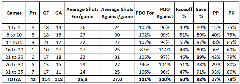 Despite the team’s apparent lack of consistency, in groups of five games, the Habs continue to produce points in the standings at a regular pace with a 0.700 points percentage over the last five games. Considering the schedule (13 games in 23 days), the injuries, and goaltending issues, the Habs have undoubtedly avoided a season-breaking meltdown scenario that was almost writing itself.