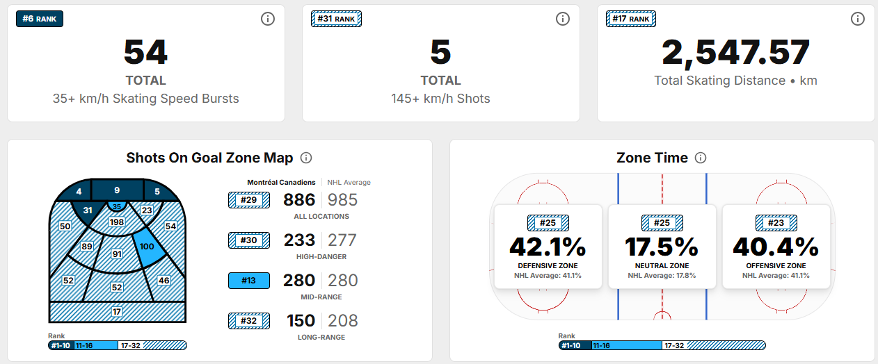 Advanced stats presented by NHL Edge are shown below. Although they don’t seem to show great improvement in zone time ranking (in All Strength), a detailed look shows them as being 16th in the league in Offensive Zone Time at even strength and third in the league on power play. On the PK, they are 30th in the league in Offensive Zone Time but yet fifth-lowest in Defensive Zone Time. This is due to them spending the most amount of time in the neutral zone in the league shorthanded.