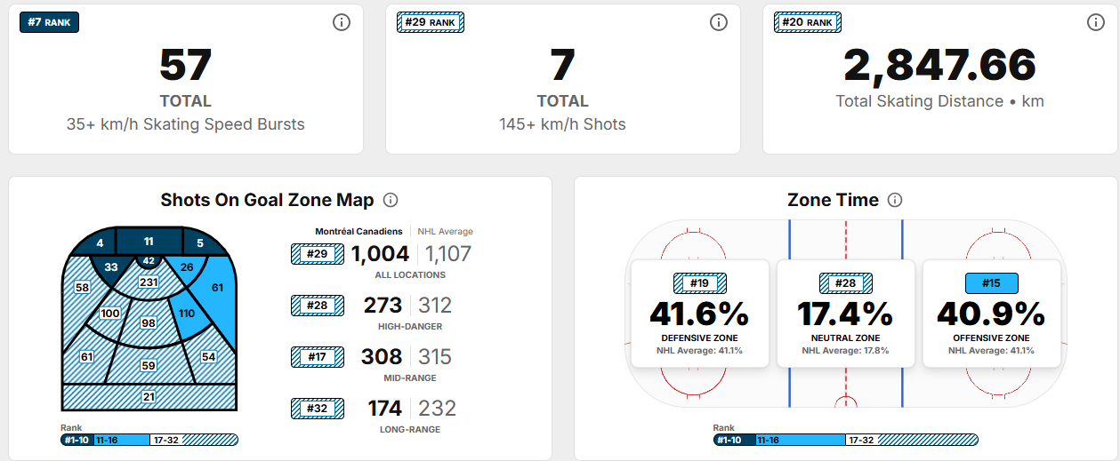 Advanced stats presented by NHL Edge are shown below. The team has improved its zone time ranking as of late in both the offensive (23rd after 35 games) and defensive zones (25th after 35 games). Although their total shots on goal are among the worst in the league, this is skewed by a very low count of long-range shots, which is by far the worst in the league. This is not surprising considering that they lack a powerful shooter at the blueline and their style of play involves having mobile defencemen carrying the puck low to create chaos. Their conversion rate remains the second-best in the league at 13.2%.