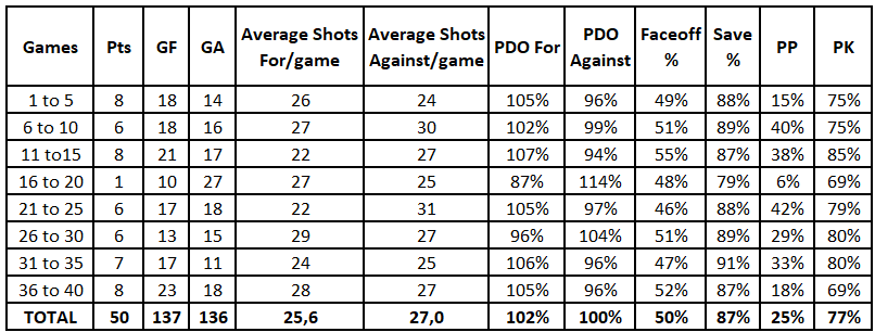 At one game away from midseason, the Habs continue to show impressive consistency in groups of five games, albeit a little less on a game-to-game basis. This last five games is yet another stint well above 0.600 hockey with eight points out of 10. They also topped their highest goals scored over five games with 23. Although they are still below a 0.900 in save percentage for all but one group of five games, they have returned to a positive goal differential (+1) for the first time since November.