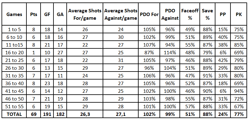 Statistically, the Habs remain in line with their yearly averages in most columns. Nonetheless, faceoffs have improved considerably in the last 10 games. Clearly, the arrival of Phillip Danault is showing its desired effect in the faceoff circle. That said, it has yet to yield improvement on the penalty kill so far.