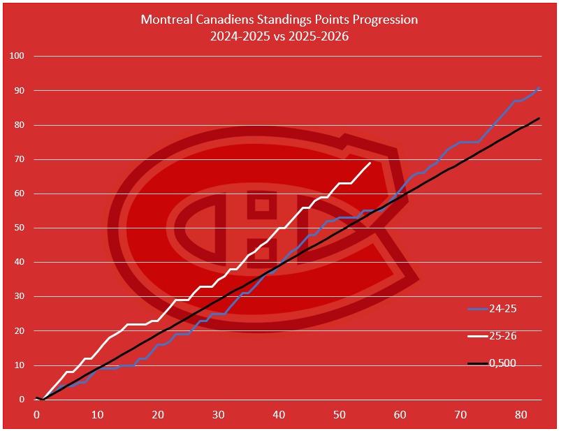 Compared to last year, the Habs are 14 points ahead after the 55-game mark.The team reached 69 points on March 12th last year, in game No. 65.